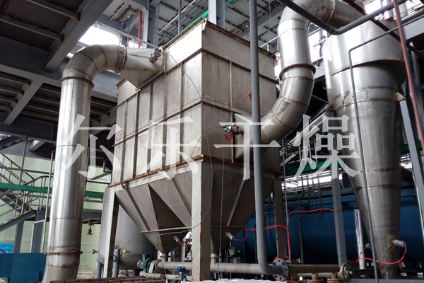 散粒狀固體物料由加料器加入流化床干燥器中,過(guò)濾后的潔凈空氣加熱后由鼓風(fēng)機送入流化床底部經(jīng)分布板與固體物料接觸,形成流態(tài)化達到氣固的熱質(zhì)交換。物料干燥后由排料口排出,廢氣由沸騰床頂部排出經(jīng)旋風(fēng)除塵器組和布袋除塵器回收固體粉料后排空。